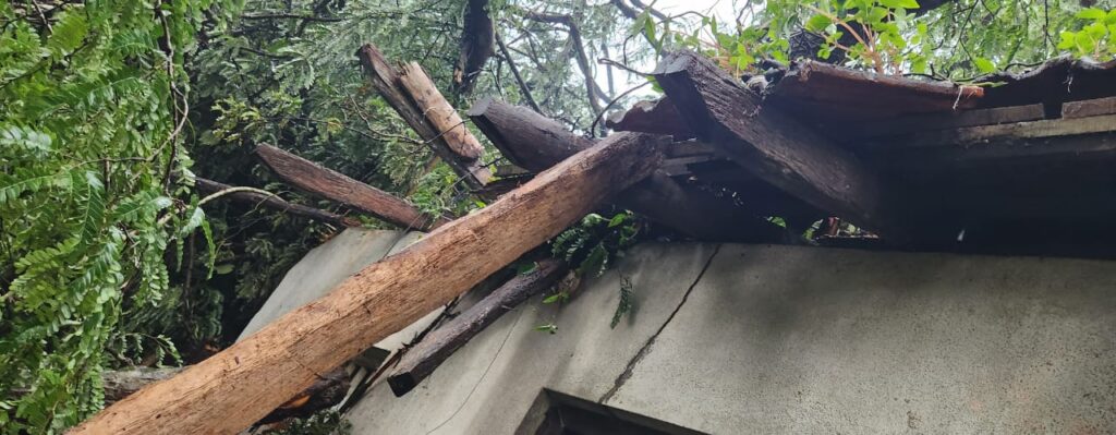 ವಿಪರೀತ ಗಾಳಿಗೆ ಏಕಾಏಕಿ ಮನೆಯ ಮೇಲೆ ಮರ ಬಿದ್ದಿದೆ.