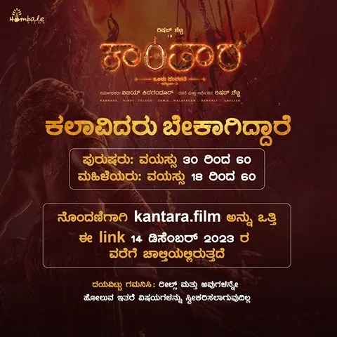30 ರಿಂದ 60 ವರ್ಷದ ಪುರುಷ ಕಲಾವಿದರು. 18 ರಿಂದ 60 ವರ್ಷದ ಮಹಿಳಾ ಕಲಾವಿದರಿಗೆ ನಟಿಸುವ ಅವಕಾಶವನ್ನು ಕಾಂತಾರ ತೆರೆದಿಟ್ಟಿದೆ. ಡಿಸೆಂಬರ್ 14ರವರೆಗೂ ಅರ್ಜಿ ಸಲ್ಲಿಸಲು ಅವಕಾಶ ನೀಡಿದೆ.