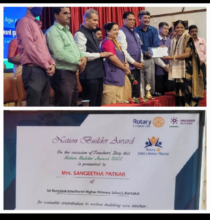 ಬಂಟಕಲ್ಲು: ಬಂಟಕಲ್ಲು ಶ್ರೀ ದುರ್ಗಾಪರಮೇಶ್ವರಿ ಹಿರಿಯ ಪ್ರಾರ್ಥಮಿಕ ಶಾಲೆಯ ಗೌರವ ಶಿಕ್ಷಕಿ ಶ್ರೀಮತಿ ಸಂಗೀತ ಪಾಟ್ಕರ್ ರವರಿಗೆ ಅಂತರಾಷ್ಟ್ರಿಯ ರೋಟರಿಯು, ಶಿಕ್ಷಕ ವೃತ್ತಿಯಲ್ಲಿರುವ ಆಯ್ದ ಶಿಕ್ಷಕರಿಗೆ ಕೊಡಮಾಡುವ NATION BUILDER AWARD ಷ್ರಶಸ್ತಿಯನ್ನು ನೀಡಲಾಗಿದೆ.