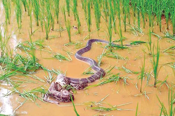 ಹಳನೀರಿನ ಮುತ್ತಮ್ಮ ಶೆಡ್ತಿ ಅವರ ಗದ್ದೆಯಲ್ಲಿ ಹೆಬ್ಬಾವು ಕಾಳಿಂಗ ಸರ್ಪದ ತಲೆಯನ್ನು ನುಂಗಿತ್ತು. ಬಳಿಕ ಕಾಳಿಂಗ ಸರ್ಪದ ಉಳಿದ ಭಾಗವನ್ನು ಹೆಬ್ಬಾವಿಗೆ ನುಂಗಲಾಗದೇ ಅದನ್ನು ಸುತ್ತು ಹಾಕಲು ಪ್ರಯತ್ನಿಸುತ್ತಿತ್ತು. ಹೆಬ್ಬಾವಿನ ಬಾಲವನ್ನು ಕಾಳಿಂಗ ಸರ್ಪ ಕೂಡ ಸುತ್ತುಹಾಕಿಕೊಂಡಿತ್ತು. ಕೂಡಲೇ ಸ್ಥಳೀಯರು ಗಮನಿಸಿ ಸ್ನೇಕ್ ಶಂಕರ್ಗೆ ಮಾಹಿತಿ ನೀಡಿದ್ದಾರೆ.