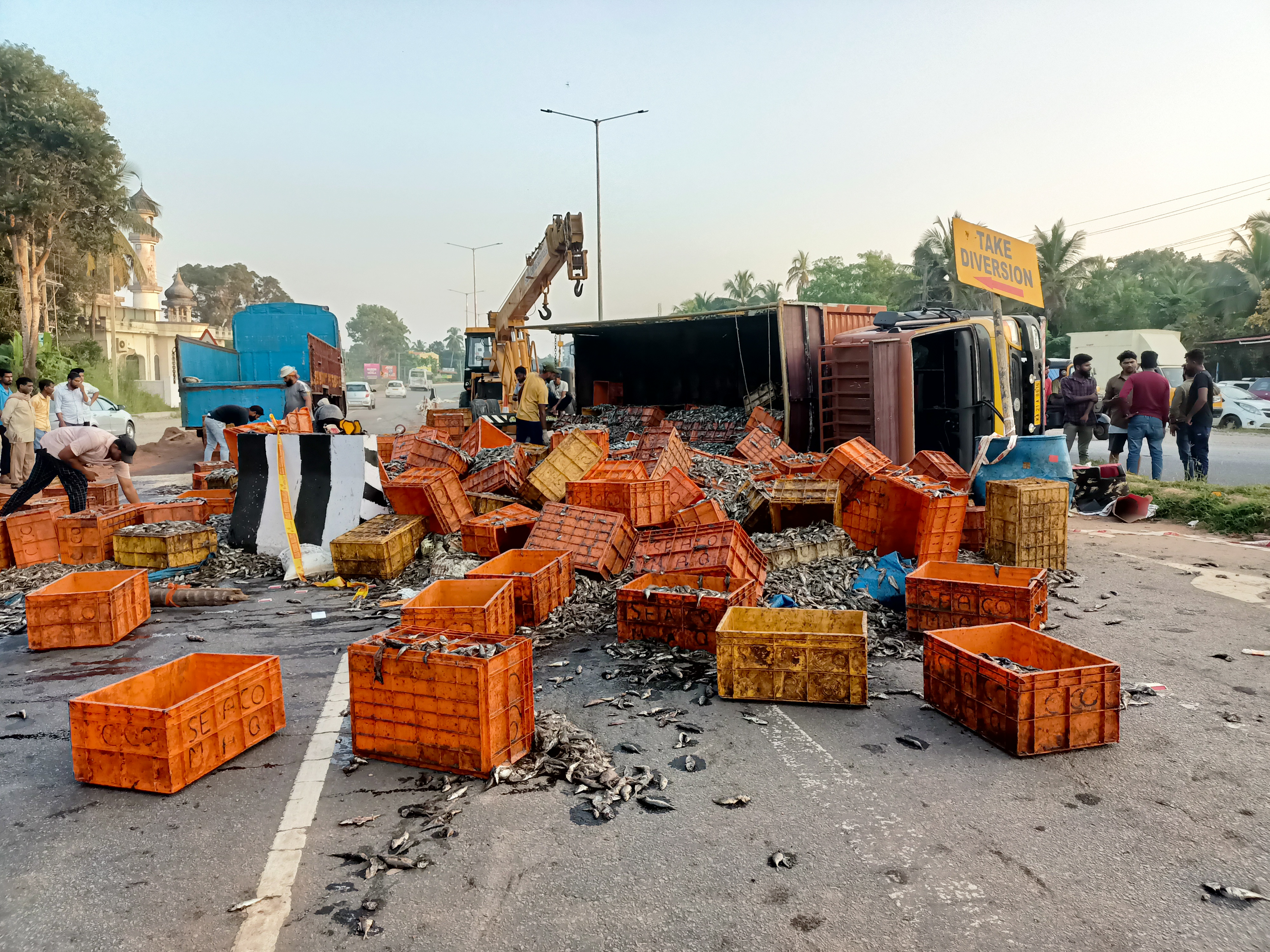 - ಲಾರಿ ಪಲ್ಟಿಯಾದ ಹಿನ್ನೆಲೆ ರಸ್ತೆಯಲ್ಲೆಲ್ಲಾ ಮೀನುಗಳು ಚೆಲ್ಲಾಪಿಲ್ಲಿಯಾಗಿ ಬಿದ್ದಿದ್ದು, ಈ ಬಗ್ಗೆ ತಿಳಿಯುತ್ತಿದ್ದಂತೆ ಹಲವಾರು ಜನ ಜಮಾವಣೆಗೊಂಡಿದ್ದಾರೆ.
