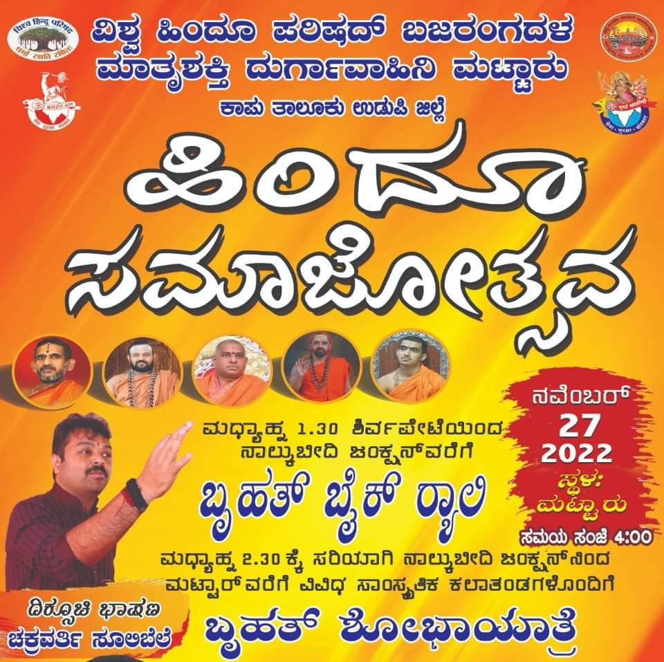 ಮಾತೃಶಕ್ತಿ ದುರ್ಗಾವಾಹಿನಿ ಮಟ್ಟಾರು, ಕಾಪು ತಾಲೂಕು ಉಡುಪಿ ಜಿಲ್ಲೆ ಇವರ ವತಿಯಿಂದ, ನವೆಂಬರ್ 27 ರಂದು ಮಧ್ಯಾಹ್ನ 4ರಿಂದ ಮಟ್ಟಾರಿನಲ್ಲಿ ಹಿಂದೂ ಸಮಾಜೋತ್ಸವ ನಡೆಯಲಿದೆ.