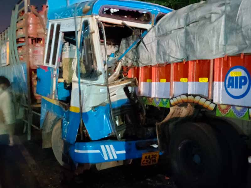 ಡಿಕ್ಕಿ ಹೊಡೆದ ರಭಸಕ್ಕೆ ಹಿಂಬದಿ ಲಾರಿಯು ಸಂಪೂರ್ಣ ನುಜ್ಜುಗುಜ್ಜಾಗಿದ್ದು ಘಟನೆಯಲ್ಲಿ ಯಾವುದೇ ಪ್ರಾಣಾಪಾಯ ಉಂಟಾಗಿಲ್ಲ.