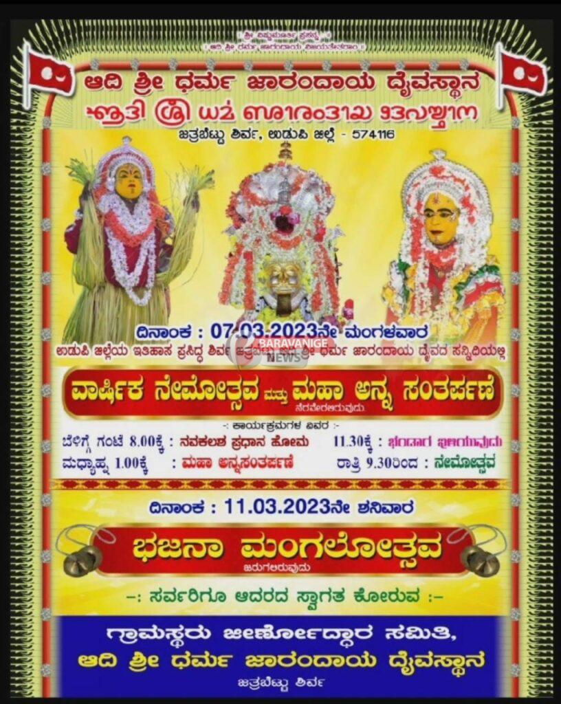 (ಮಾ.7) ಶಿರ್ವ : ಜತ್ರಬೆಟ್ಟು ಆದಿ ಶ್ರೀ ಧರ್ಮ ಜಾರಂದಾಯ ದೈವಸ್ಥಾನದಲ್ಲಿ ವಾರ್ಷಿಕ ನೇಮೋತ್ಸವ ಮತ್ತು ಮಹಾ ಅನ್ನಸಂತರ್ಪಣೆ
