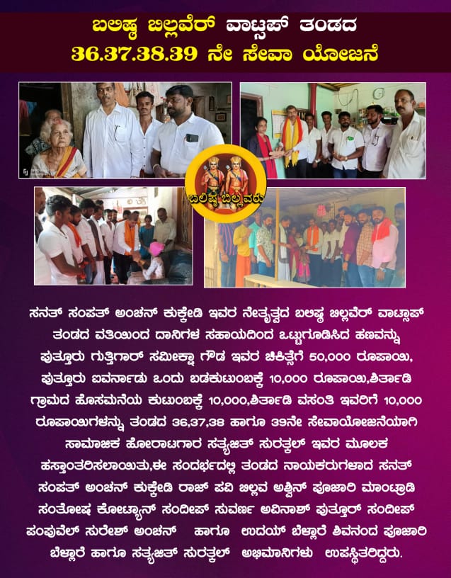 ವೇಣೂರು: ಸನತ್ ಸಂಪತ್ ಅಂಚನ್ ಕುಕ್ಕೇಡಿ ಇವರ ನೇತೃತ್ವದ ಬಲಿಷ್ಠ ಬಿಲ್ಲವೆರ್ ವಾಟ್ಸಾಪ್ ತಂಡದ ವತಿಯಿಂದ ದಾನಿಗಳ ಸಹಾಯದಿಂದ ಒಟ್ಟುಗೂಡಿಸಿದ ಹಣವನ್ನು ಪುತ್ತೂರು ಗುತ್ತಿಗಾರ್ ಸಮೀಕ್ಷಾ ಗೌಡ ಇವರ ಚಿಕಿತ್ಸೆಗೆ 50,000 ರೂಪಾಯಿ,ಪುತ್ತೂರು ಐವರ್ನಾಡು ಒಂದು ಬಡಕುಟುಂಬಕ್ಕೆ 10,000 ರೂಪಾಯಿ,ಶಿರ್ತಾಡಿ ಗ್ರಾಮದ ಹೊಸಮನೆಯ ಕುಟುಂಬಕ್ಕೆ 10,000,ಶಿರ್ತಾಡಿ ವಸಂತಿ ಇವರಿಗೆ 10,000 ರೂಪಾಯಿಗಳನ್ನು ತಂಡದ 36,37,38 ಹಾಗೂ 39ನೇ ಸೇವಾಯೋಜನೆಯಾಗಿ ಸಾಮಾಜಿಕ ಹೋರಾಟಗಾರ ಹಿಂದು ಮುಖಂಡ ಸತ್ಯಜಿತ್ ಸುರತ್ಕಲ್ ಇವರ ಮೂಲಕ ಹಸ್ತಾಂತರಿಸಲಾಯಿತು,