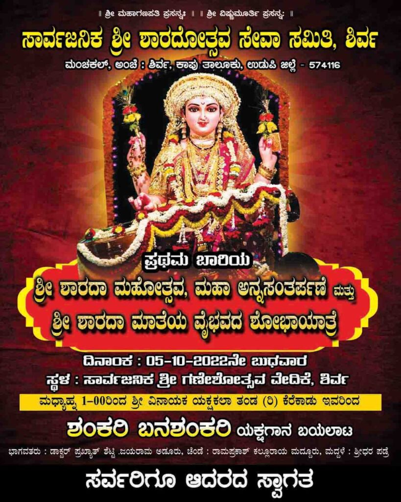 ಶಿರ್ವ : ಸಾರ್ವಜನಿಕ ಶ್ರೀ ಶಾರದೋತ್ಸವ ಸೇವಾ ಸಮಿತಿ, ಶಿರ್ವ ವತಿಯಿಂದ ಪ್ರಥಮ ಬಾರಿಯ ಶ್ರೀ ಶಾರದಾ ಮಹೋತ್ಸವ, ಮಹಾ ಅನ್ನಸಂತರ್ಪಣೆ ಮತ್ತು ಶ್ರೀ ಶಾರದಾ ಮಾತೆಯ ವೈಭವದ ಶೋಭಾಯಾತ್ರೆ ಅಕ್ಟೋಬರ್ 05, ಬುಧವಾರದ ವಿಜಯದಶಮಿಯಂದು ಶಿರ್ವದ ಸಾರ್ವಜನಿಕ ಶ್ರೀ ಗಣೇಶೋತ್ಸವ ವೇದಿಕೆಯಲ್ಲಿ ನಡೆಯಲಿದೆ.