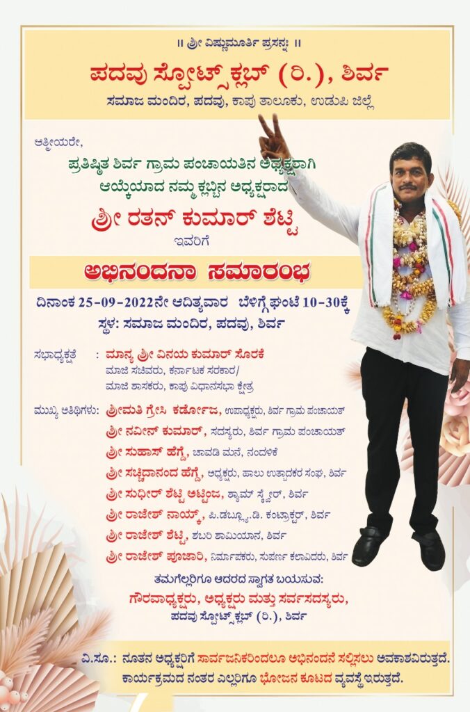 ಪದವು : ಪದವು ಸ್ಪೋರ್ಟ್ಸ್ ಕ್ಲಬ್ (ರಿ) ಶಿರ್ವ ವತಿಯಿಂದ ಪ್ರತಿಷ್ಠಿತ ಶಿರ್ವ ಗ್ರಾಮ ಪಂಚಾಯಿತಿ ಅಧ್ಯಕ್ಷರಾಗಿ ಆಯ್ಕೆಯಾದ ಕ್ಲಬ್ ಅಧ್ಯಕ್ಷರಾದ ರತನ್ ಕುಮಾರ್ ಶೆಟ್ಟಿ ಅವರಿಗೆ ಅಭಿನಂದನಾ ಸಮಾರಂಭ ಶಿರ್ವ ಪದವಿನ ಸಮಾಜ ಮಂದಿರದಲ್ಲಿ ಸೆ. 25 ರಂದು ನಡೆಯಲಿದೆ.