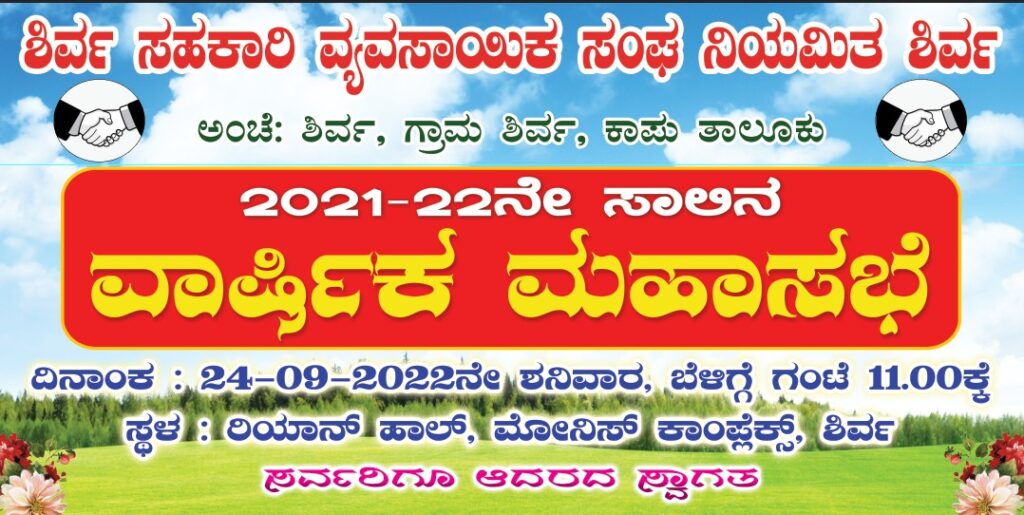 ಶಿರ್ವ: ಸಹಕಾರಿ ವ್ಯವಸಾಯಿಕ ಬ್ಯಾಂಕ್ ಸಂಘ ನಿಯಮಿತ ಶಿರ್ವದ 2021-22ನೇ ಸಾಲಿನ ವಾರ್ಷಿಕ ಮಹಾಸಭೆ ಸೆ. 24ರಂದು ರಿಯಾನ್ ಹಾಲ್, ಮೋನಿಸ್ ಕಾಂಪ್ಲೆಕ್ಸ್, ಶಿರ್ವದಲ್ಲಿ ನಡೆಯಲಿದೆ ಎಂದು ಪ್ರಕಟಣೆಯಲ್ಲಿ ತಿಳಿಸಿದ್ದಾರೆ.