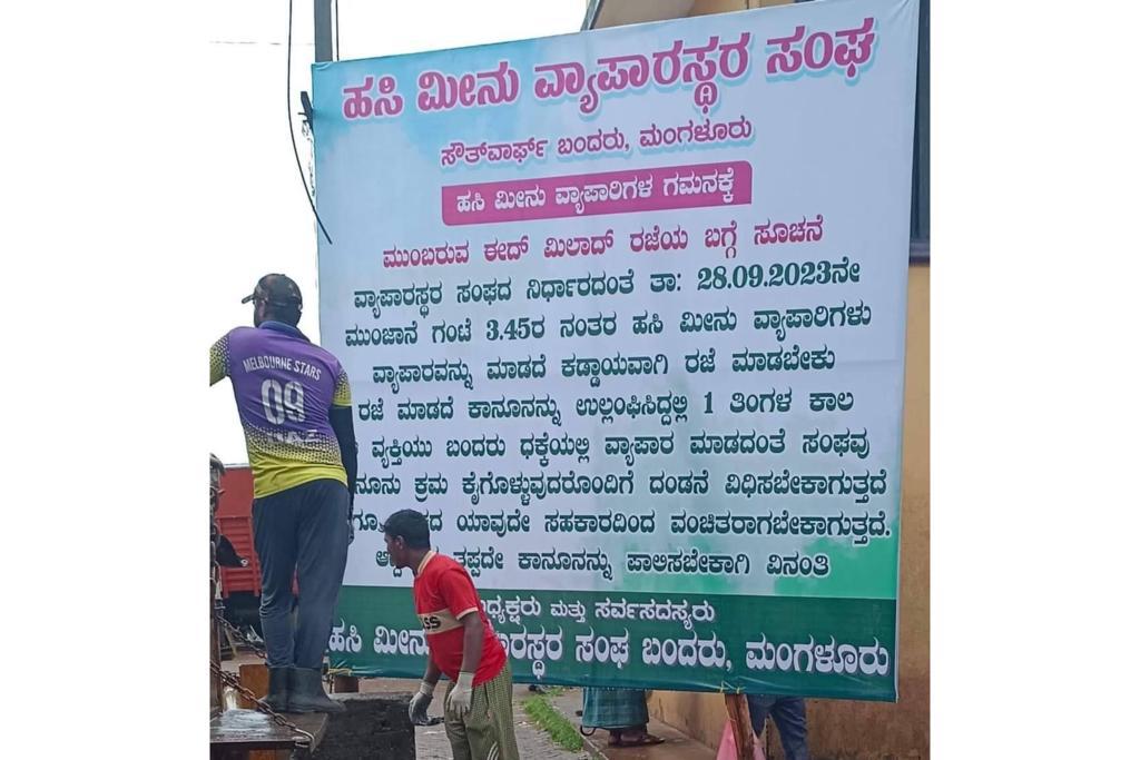 ಮಂಗಳೂರು : ಹಸಿ ಮೀನು ಮಾರುವವರಿಗೆ ನೀಡಿರುವ ಎಚ್ಚರಿಕೆ ಬ್ಯಾನರೊಂದು ಸೋಷಿಯಲ್ ಮೀಡಿಯಾದಲ್ಲಿ ಹರಿದಾಡ್ತಿದೆ. ಈದ್ ಮಿಲಾದ್ ದಿನವಾದ ಸೆ. 28ರಂದು ಮೀನು ಮಾರಾಟ ಮಾಡಬಾರದು, ಅಂದು ವ್ಯಾಪಾರಸ್ಥರು ಕಡ್ಡಾಯ ರಜೆ ಮಾಡಬೇಕು ಅಂತ ಹೊರಡಿಸಿದ ಕಟ್ಟಪ್ಪಣೆ ಚರ್ಚೆಗೆ ನಾಂದಿ ಹಾಡಿದೆ.