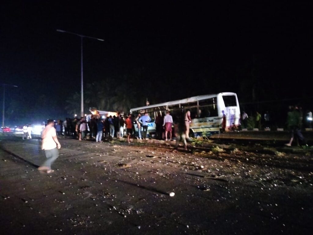 ಕುಂದಾಪುರ, ಅ.19: ಖಾಸಗಿ ಬಸ್ಸೊಂದು ಚಾಲಕನ ನಿಯಂತ್ರಣ ತಪ್ಪಿ ಪಲ್ಟಿ ಹೊಡೆದು 18 ಕ್ಕೂ ಅಧಿಕ ಪ್ರಯಾಣಿಕರು ಗಾಯಗೊಂಡ ಘಟನೆ ಅರಾಟೆ ಮುಳ್ಳಿಕಟ್ಟೆ ನಡುವೆ ರಾಷ್ಟ್ರೀಯ ಹೆದ್ದಾರಿ 66 ರಲ್ಲಿ ಬುಧವಾರ ಸಂಜೆ ನಡೆದಿದೆ.
