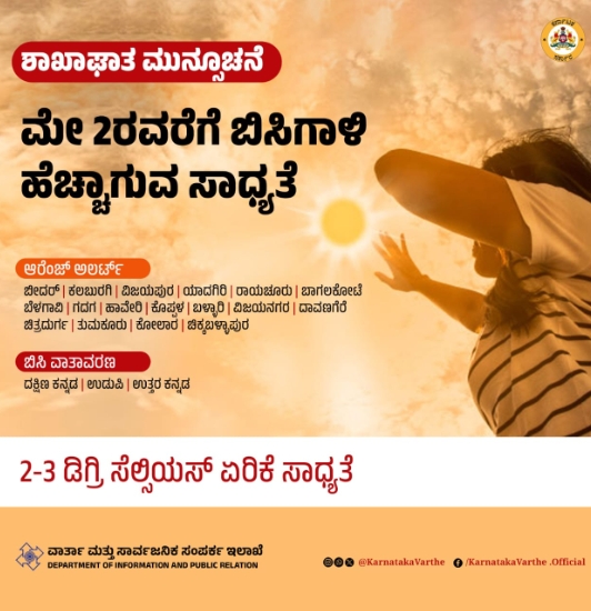 ದಕ್ಷಿಣ ಕನ್ನಡದಲ್ಲಿ ಇನ್ನೂ ನಾಲ್ಕು ದಿನ ಬಿಸಿ ವಾತಾವರಣ ಮುಂದುವರಿಯಲಿದೆ. ರಾಜ್ಯದ ಬೀದರ್, ಕಲಬುರಗಿ, ವಿಜಯಪುರ, ಯಾದಗಿರಿ, ರಾಯಚೂರು, ಬಾಗಲಕೋಟೆ, ಬೆಳಗಾವಿ, ಗದಗ, ಹಾವೇರಿ, ಕೊಪ್ಪಳ, ಬಳ್ಳಾರಿ, ವಿಜಯನಗರ, ದಾವಣಗೆರೆ, ಚಿತ್ರದುರ್ಗ, ತುಮಕೂರು, ಕೋಲಾರ, ಚಿಕ್ಕಬಳ್ಳಾಪುರ ಜಿಲ್ಲೆಗಳಲ್ಲಿ ಆರೆಂಜ್ ಅಲರ್ಟ್ ಘೋಷಿಸಲಾಗಿದೆ.