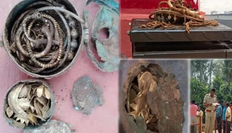 ದೇವಸ್ಥಾನ ಆವರಣದಲ್ಲಿ ಕೆಲಸ ಮಾಡುತ್ತಿದ್ದ ಕಾರ್ಮಿಕರು ಕೆಲಸ ಮಾಡುತ್ತಿದ್ದಾಗ ಮಣ್ಣಿನ ಮಡಕೆಯಲ್ಲಿ ಚಿನ್ನದ ನಗನಾಣ್ಯ ಪತ್ತೆಯಾಗಿವೆ.