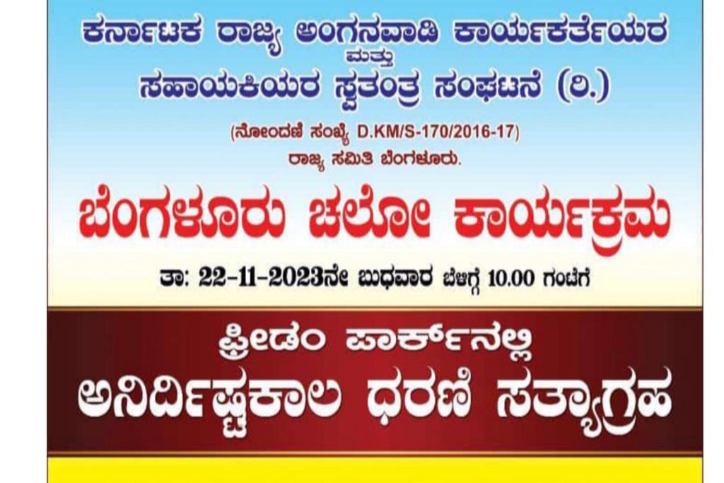 ಬೆಂಗಳೂರು, ನ.21: ಸರ್ಕಾರದ ವಿರುದ್ಧ ಅಂಗನವಾಡಿ ಕಾರ್ಯಕರ್ತೆಯರು ಹೊಸ ಸಮರ ಸಾರಿದ್ದಾರೆ. ವಿವಿಧ ಬೇಡಿಕೆಗಳ ಈಡೇರಿಕೆಗೆ ಆಗ್ರಹಿಸಿ ಬೆಂಗಳೂರು ಚಲೋ ನಡೆಸಲು ಮುಂದಾಗಿದ್ದಾರೆ. ಕರ್ನಾಟಕ ರಾಜ್ಯ ಅಂಗನವಾಡಿ