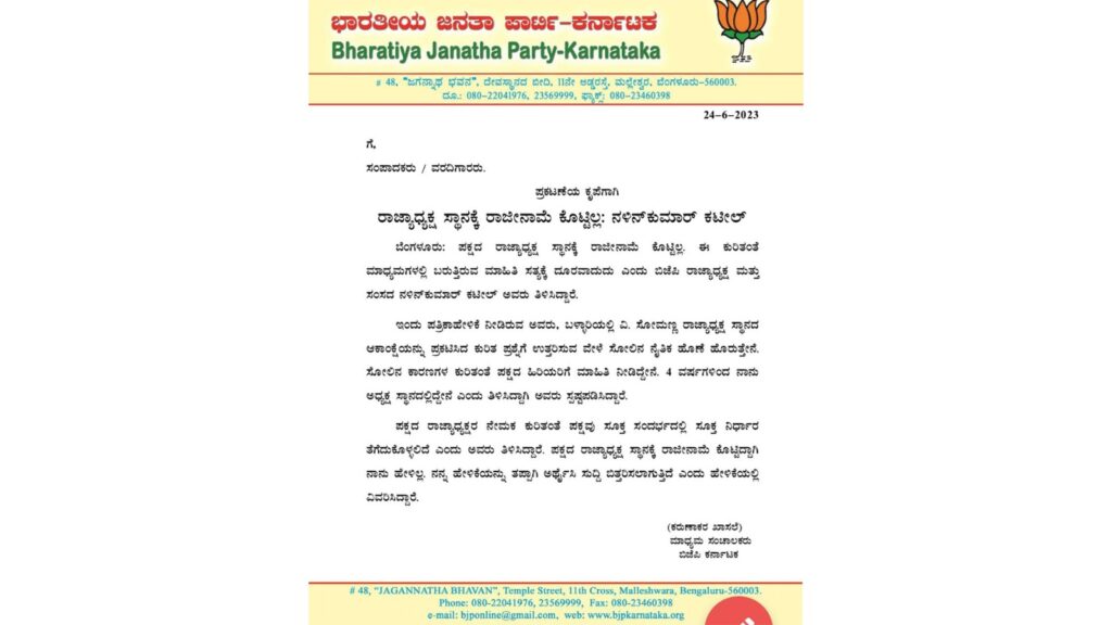 ಬೆಂಗಳೂರು : ಪಕ್ಷದ ರಾಜ್ಯಾಧ್ಯಕ್ಷ ಸ್ಥಾನಕ್ಕೆ ರಾಜೀನಾಮೆ ಕೊಟ್ಟಿಲ್ಲ. ಈ ಕುರಿತಂತೆ ಮಾಧ್ಯಮಗಳಲ್ಲಿ ಬರುತ್ತಿರುವ ಮಾಹಿತಿ ಸತ್ಯಕ್ಕೆ ದೂರವಾದುದು ಎಂದು ಬಿಜೆಪಿ ರಾಜ್ಯಾಧ್ಯಕ್ಷ ಮತ್ತು ಸಂಸದ ನಳಿನ್
