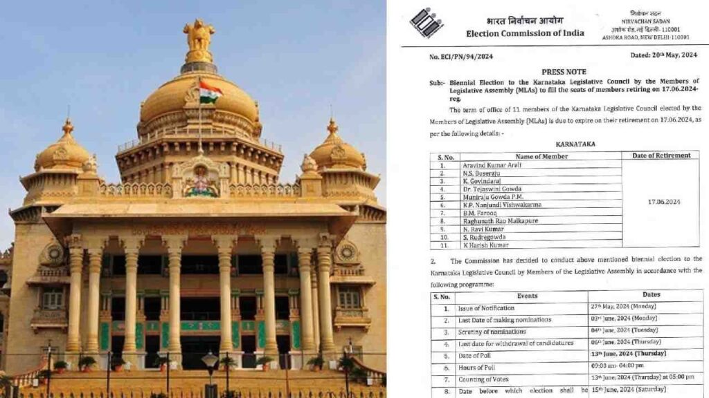 ಬೆಂಗಳೂರು: ಮುಂದಿನ ತಿಂಗಳು ತೆರವಾಗಲಿರುವ ಕರ್ನಾಟಕ ವಿಧಾನ ಪರಿಷತ್ 11 ಸ್ಥಾನಗಳಿಗೆ ಚುನಾವಣಾ ದಿನಾಂಕ ಘೋಷಣೆಯಾಗಿದೆ. ಜೂನ್ 13ರಂದು ಮತದಾನ ನಡೆಯಲಿದೆ. ನಾಮಪತ್ರ ಸಲ್ಲಿಸಲು ಜೂನ್ 3